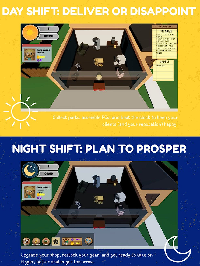 PC Express is a business simulation where you design, build, and sell custom PCs to grow your tech empire. Start from a small garage workshop with limited parts and tools, and upgrade your store to unlock new features, components, and customers. Manage resources, optimize builds, and satisfy a growing customer base, from budget gamers to professional creators. Unlock advanced CPUs, GPUs, RAMs, and many more. Balance efficiency, quality, and reputation as you scale your business from humble beginnings to a state-of-the-art tech studio. Every decision matters, how you build, how you upgrade, and how you grow will determine whether your store becomes a local favorite or a tech powerhouse, but remember to do it all on time.